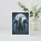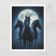 Three majestic black horses standing proudly under the glow of a full moon. The scene is bathed in a mysterious, blue-tinged light, and the low grasses in the foreground add to the wildness and natural feel. The horses have white markings on their foreheads, which contrast sharply with their dark coats.