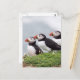 Three Skomer Island puffins sitting in a row on the cliff edge.
