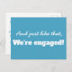 Uma design de tipografia mínima engraçada, em azul e branco, com um legal emparelhamento de texto que diz: E assim, estamos engajados! com um modelo de texto no verso para que você adicione seu texto personalizado com cores azuis e brancas invertidas. #savethedate