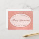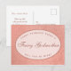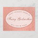 Sobre um fundo dourado rosa, há um oval branco transparente com texto dentro. As palavras "Fada Madrinha" estão escritas em uma fonte caligráfica elegante, o restante em letras maiúsculas curvas menores para cima e para baixo. No verso, há uma mensagem e um endereço. A mensagem no verso está escrita na mesma fonte de escrita à mão. Todo o texto tem uma cor marrom-avermelhada semelhante ao fundo dourado rosa.