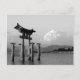 Fotografia branca e preta do grande portão torii no Shrine Itsukushima, na Ilha de Miyajima, no Japão.