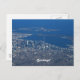 Foto do centro Toronto vindo do ar para uma aterrissagem num avião da Europa. Vocês podem ver a Torre CN, uma grande atração turística, Harbourfront, e o lindo lago azul Ontário com as Ilhas Toronto.