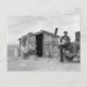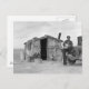 Repro de fotos mostrando a casa de um trabalhador migratório mexicano de campo na borda de um campo de ervilha congelado, Vale Imperial, Califórnia. Foto de Dorothea Lange, em 1937, para a Administração de Segurança da Fazenda. Meio original em LOC: nitrato negativo.