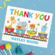 Este cartão de agradecimento de aniversário de animal de circo apresenta animais do zoológico em um safári. O trem contém uma girafa, elefante, tigre e um hipopótamo fofo acima do monograma de suas crianças escrito sob cores laranja, verde, vermelho e azul.