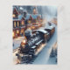Cartão postal de Natal personalizado com ilustração de IA de um trem vintage viajando por uma vila nevada em um dia de inverno.