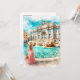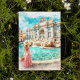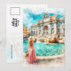 Este postal apresenta um retrato a aquarelas de uma mulher loura que joga uma moeda na fonte Trevi, em Roma, Itália.