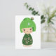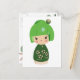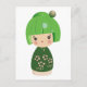 Boneca Kokeshi com flores e borboletas entalhadas.