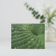 Um close-up de uma folha de hosta verde está representado neste cartão postal botânico da fotografia de arte. As veias criam um padrão abstrato espiral circular. A chuva recente depositou gotículas de água e as gotas de chuva refletem a luz. Essa planta também é conhecida como funkia, plátano lírio ou giboshi (no Japão). Que ideia excelente para um jardineiro ou amante da natureza!