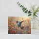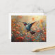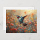 Um vibrante design de dissociação por aquarela, com um beija-flor arruinado, pairando entre flores delicadas, capturando a graça e a energia da natureza em floração.