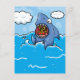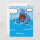 Apresentando um incrível Excelente de desenho animado Shark Branco com um presente de aniversário vermelho e amarelo balanceado em sua língua em um mar azul cortado.
