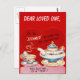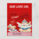 Este cartão-postal apresenta uma imagem de namorados antiga, com um bule de chá e uma xícara de chá. O texto lê, eu estou todo embrulhado sobre você namorados, você me dá um chá!" A cor de fundo e o texto "Querido Amado" podem ser personalizados conforme desejado.