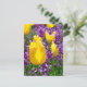 Uma tulipa amarela brilhante contra flores roxas faz um cartão postal floral vívido.