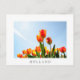 Cartão postal com flores compostas por tulipas laranja e vermelha vistas de baixo ponto de vista contra um céu azul com uma fronteira branca e o texto "Holanda".