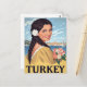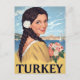 A lovely vintage-style travel poster for Turkey. This beautiful illustration features a smiling woman with braided hair and a flower tucked behind her ear, holding a colorful bouquet. In the background, a sunny coastal city skyline and sailing boats evoke the beauty of the Turkish Riviera or Istanbul's waterways. This retro artwork is perfect for those who love Mediterranean travel, collectors of vintage portraiture, or anyone who appreciates bright, classic poster designs.