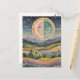 Esta é uma pintura de paisagem simbólica e caprichosa que apresenta uma vasta encosta rolada sob um céu celeste. As colinas são renderizadas em uma série de linhas ondulantes e varridas e uma paleta mutada de verdes, amarelos, azuis e pínus macios, sugerindo um terreno fértil, como um sonho. O primeiro plano é preenchido com uma densa variedade de plantas estilizadas e flores. Dominar o céu é uma grande órbita central que representa uma face celeste, dividida entre um perfil humano e um padrão geométrico, semelhante ao mosaico. O céu acima é um índio profundo, pontilhado de estrelas ouros, com uma lua de cheio visível à direita. O estilo é altamente decorativo e folclórico, com senso de harmonia cósmica e maravilha natural.