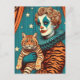 Um palhaço bonitinho na impressão de tigre segura um gato grande de gengibre