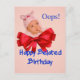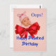 Esta design mostra uma criança dizendo "Oops" com um gesto de surpresa ao não lembrar seu aniversário. É um design humorístico para uma ocasião de aniversário tardia