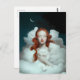 Ilustração de uma mulher cabeleira vermelha com um gato branco nas nuvens, sob a lua, no estilo da arte digital