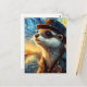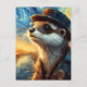 IA gerou arte de uma lontra em uma cidade noturna estrelada ao longo de um rio vestindo um chapéu e terno índio