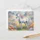Um cartão postal mostrando uma imagem sonhadora de um unicórnio branco com um mané arco-íris parado em um campo de flores. Ao fundo estão montanhas majestosas. O presente perfeito para dar àqueles que amam unicórnios mágicos e místicos. Contém conteúdo generativo.