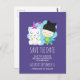 Cartão postal Salve a Data com uma imagem caprichosa de um unicórnio e um pássaro. Esse par está felizmente sorrindo enquanto se diverte junto. Um pequeno coração paira acima de suas cabeças. O unicórnio é branco com asas de anjo e um chifre rosa. O pássaro é de uma cor azul esverdeada usando um touca preta com um gatinho preto com orelhas. Uma nuvem azul colocada atrás desses melhores amigos felizes.
