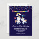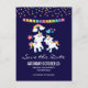 Cartão postal de festa de reserva de data com 2 unicórnios dançantes fofos com caudas e crinas brilhantes e coloridas. Um arco-íris colorido com nuvens de cada lado acima de suas cabeças. Outros elementos incluem uma pequena flor, um coração e algumas estrelas. Fundo roxo escuro. Pontos de confete coloridos e uma imagem de uma faixa de bandeirinhas ao longo do topo.
