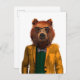 Este design apresenta um retrato de um urso vestido com óculos e um casaco.