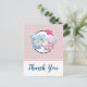 Cartão postal de agradecimento de festa com uma imagem de desenho animado fofa de um casal de ursos, a ursa é rosa pastel com um laço e está beijando a bochecha de um urso azul que parece positivamente encantado. Um pequeno coração rosa está flutuando acima de suas cabeças. Muito fofo e kawaii. O padrão de fundo é uma cor rosa suave com bolinhas brancas. Mensagem personalizada no verso.
