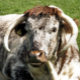 Design fotográfico de uma vaca longhorn inglesa uma raça castanha e branca de gado bovino.