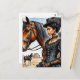 Celebrar a beleza e a força do eterno com este fino cartão postal de aquarela com uma mulher negra real, com um traje ocidental inspirado na vitoriana, ao lado do seu cavalo leal. Vestida em um vestido preto detalhado com acessórios intrincados, e colocada contra um pano de fundo iluminado por sol, esta trabalho de arte homenageia a graça feminina e o espírito de fronteira. Perfeito para enviar notas sentidas, decorar revistas, ou colecionar arte, este cartão postal combina a Americana ocidental antiga com estilo elegante e rica profundidade cultural. Destaques: - trabalho de arte de aquarela de uma vaqueira na moda Negra, de modo gótico vitoriano - Possui um poderoso cenário de pradaria rústica - Ideal para amantes de arte ocidental, fãs de moda históricos e colecionadores únicos de artigos de papelaria - Perfeito para enviar e enquadrar