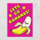 Cartaz adorável, com um desenho animado, banana amarela feliz kawaii com os sorrisos mais doces, olhos redondos grandes e meio pelados. Acima dele, em letras amarelas, com uma sombra negra lendo 'Vamos Bananas!' Duas estrelas amarelas brilhantes são de ambos os lados das palavras.