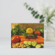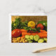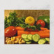 Este cartão-postal apresenta uma mesa de madeira elegante de legumes frescos crus, incluindo cenouras, tomates, pimentos, pepinos e salsa. Um limão e caju completam a seleção. Esta vida morta, colocada sobre fundo de burlap, é uma bela e saudável refeição gourmet, assim como uma composição artística colorida de vermelho, laranja, amarelo, verde, bronzeado e marrom.