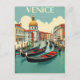 Esta imagem é um poster de viagens de estilo vintage para Veneza. Ele apresenta uma cena de canal pitoresca com várias gondolas flutuando na água. A arquitetura inclui edifícios coloridos e uma estrutura dominada proeminente no fundo. O céu está limpo com algumas nuvens, e a palavra "VENICE" aparece de forma destacada no topo.