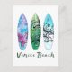 Trío de pranchas de surf artisticamente decoradas é um design perfeito para a famosa Venice Beach, Califórnia, conhecida por seu surf, passeio eclético e cena de vôlei.
