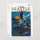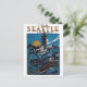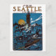 Um poster vintage de promoção de viagem para Seattle, Washington, durante o ano de 1915. Uma bela vista do porto e arquitetura de Seattle, como vista à noite com uma ascensão de lua de cheio no fundo.