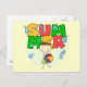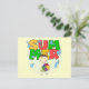 Camisetas, capuzes, canecas, cartas, bolsas de praia, ímanes e outros artigos coloridos, coloridos, com um rapaz cabeludo na praia, com uma figura de palheta, e texto multicolorido que diz "SUMMER"!
