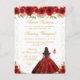 Este convite de aniversário de sweet sixteen elegante e glamoroso apresenta uma bela princesa com cabelos e pele escuros em um vestido de baile vermelho. O texto combina caligrafia manuscrita e fontes modernas sem serifa para uma aparência clássica e sofisticada. Os arranjos florais, borboletas e confetes dourados criam a combinação perfeita de rústico e chique.