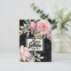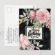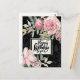 Cartão postal de aniversário inspirador com escrita sagrada retrata bela aquarela rosada, flores cor-de-rosa e folhagens com fundo preto. O verso apresenta uma parte dos versículos da Bíblia Números 6 24-26, "O Senhor te abençoe e te guarde; O Senhor faça Seu rosto brilhar sobre ti, ... e te dê paz." _
