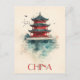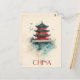 Este cartão-postal de viagem é inspirado pelos templos chineses. Há uma ilustração do templo vermelho de três andares no estilo aquarela.