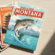 Uma ilustração do estilo de colheita mostra um grande robalo saltando de um rio com montanhas e árvores ao fundo. O texto diz "Tome uma Trip Montana".