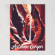 Uma ilustração retrô-estilo viagem capta as paredes deslumbrantes, ondulantes, vermelhas e laranja, de Antelope Canyon, com um feixe de luz iluminando a passagem estreita, mostrando sua beleza icônica.
