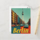 Este impressionante cartaz vintage apresenta a icônica Torre de TV de Berlim erguendo-se acima de uma cena de rua movimentada repleta de carros clássicos dos anos 1950. A obra de arte captura o espírito de Berlim em meados do século com tons quentes e suaves e texturas retrô, misturando arquitetura histórica com o charme do design automotivo do pós-guerra. Uma homenagem nostálgica a uma cidade em transformação, perfeita para os amantes da arte de viagem vintage, carros clássicos e da atmosfera urbana única de Berlim.