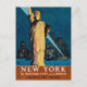 Viagens vintage de poster para Nova Iorque, mostrando a Estátua da Liberdade com barcos, linha do horizonte e luz de busca à distância, por volta de 1927.