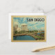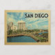 Design de San Diego California em estilo Viagens vintage com uma vista de horizonte de cidade expansiva com o porto em primeiro plano.
