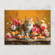 pintura clássica de vida morta mostrando um gato em meio a uma recompensa de frutas frescas e flores florescentes.