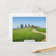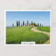 Cartão-postal de uma estrada curvatura que atravessa as culturas de cereais em direção a uma vila fazenda com uma fila de árvores ciprestes, na sua frente, perto de Pienza, no Vale de Val d'Orcia, na Toscana, Itália com borda branca e caixa branca, com o texto "Toscana".