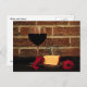 Este cartão caracteriza uma imagem simples de um vidro do vinho, de uma placa do queijo e de três flores vermelhas contra uma parede de tijolo vermelho rústica.