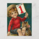 Um cartão bonito para desejar um Ano Novo muito feliz e bem-sucedido. Um garotinho e um gato seguram uma bandeira do encontro.
