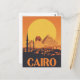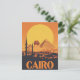 Este cartão ao estilo vintage mostra uma ilustração impressionante do horizonte do Cairo no pôr do sol. Combina lindamente as maravilhas antigas das Pirâmides e do Esfinge com a paisagem urbana moderna e seus minaretes. A ousada paleta de cores encharcada pelo sol e a tipografia retrorreflectora dão a ela um sentimento clássico e eterno, fazer-o como um cartão ideal para um viajante ou um amante da história e da cultura mundial.