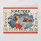 Este postal apresenta uma ilustração vintage de uma mulher com uma placa de peru colocada contra o calendário de novembro. Desfrute do seu novo cartão postal de Dia de Ação de Graças Vintage!